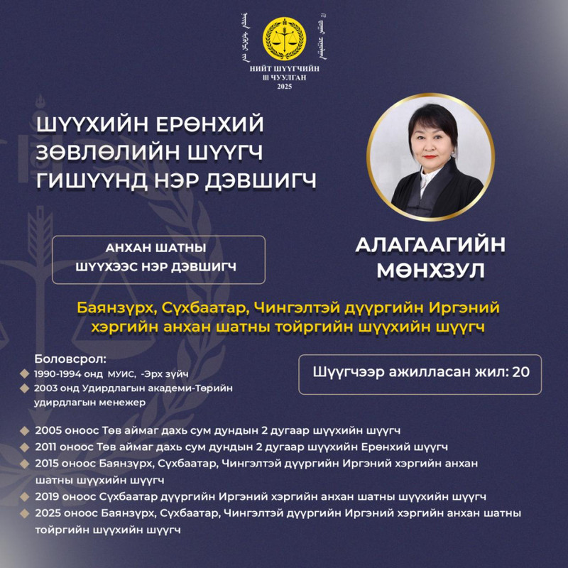 Шүүхийн ерөнхий зөвлөлийн шүүгч гишүүнд 15 шүүгч нэрээ дэвшүүлж, Нийт шүүгчийн III чуулганыг зохион байгуулах ажлын хэсэгт материалаа ирүүлсэн. Нэр дэвшигчдийн ирүүлсэн танилцуулга мэдээллийг хүргэж байна.