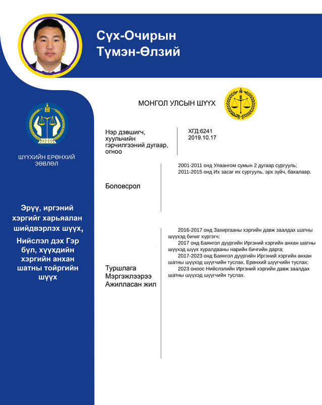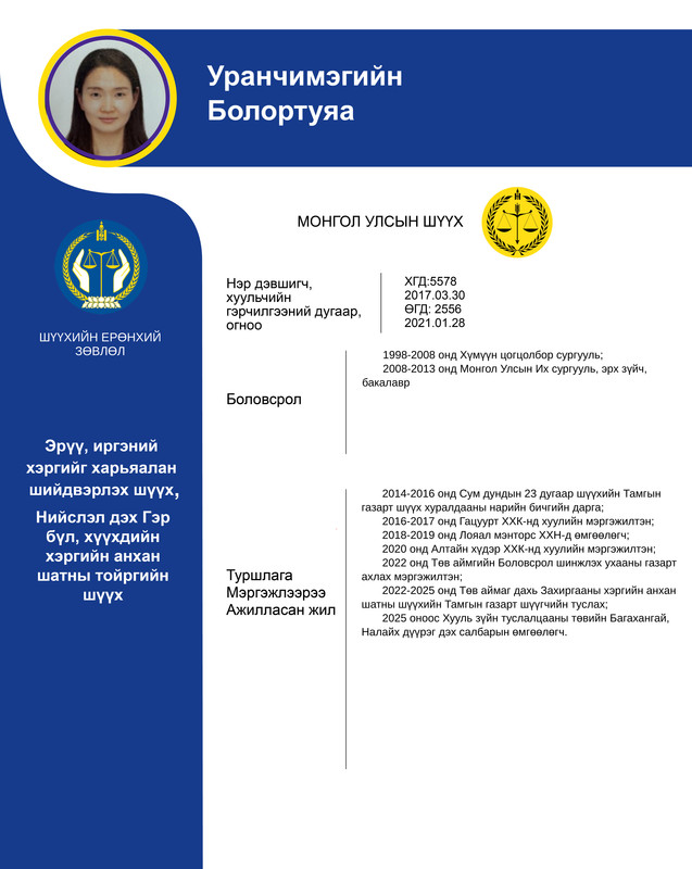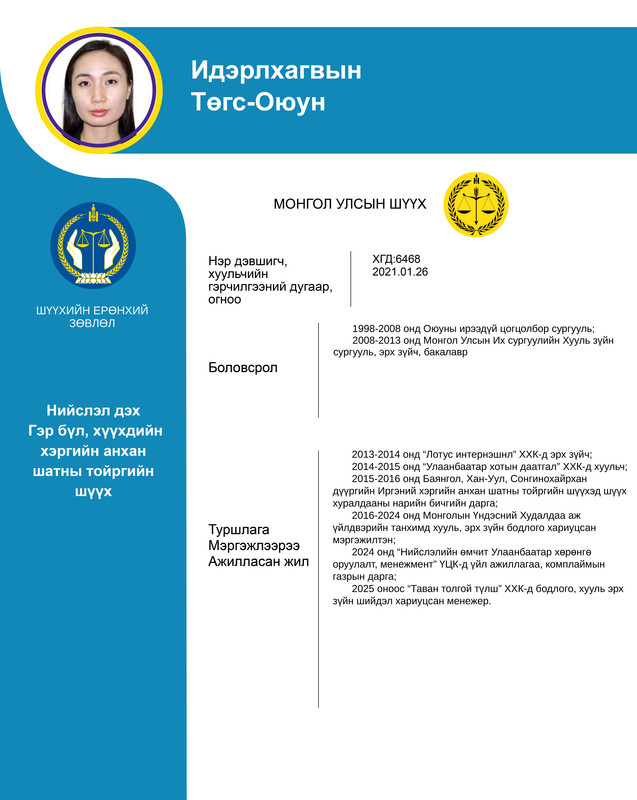 Эрүү, иргэний хэргийг харьяалан шийдвэрлэх шүүхийн шүүгчид болон Нийслэл дэх Гэр бүл, хүүхдийн хэргийн анхан шатны тойргийн шүүхийн шүүгчийн сул орон тоонд нэмж бүртгэсэн нэр дэвшигчдийн танилцуулгыг хүргэж байна. Нэр дэвшигчээс асуух асуулт, саналыг 14 хоногийн хугацаанд [email protected] цахим хаягаар хүлээн авна.