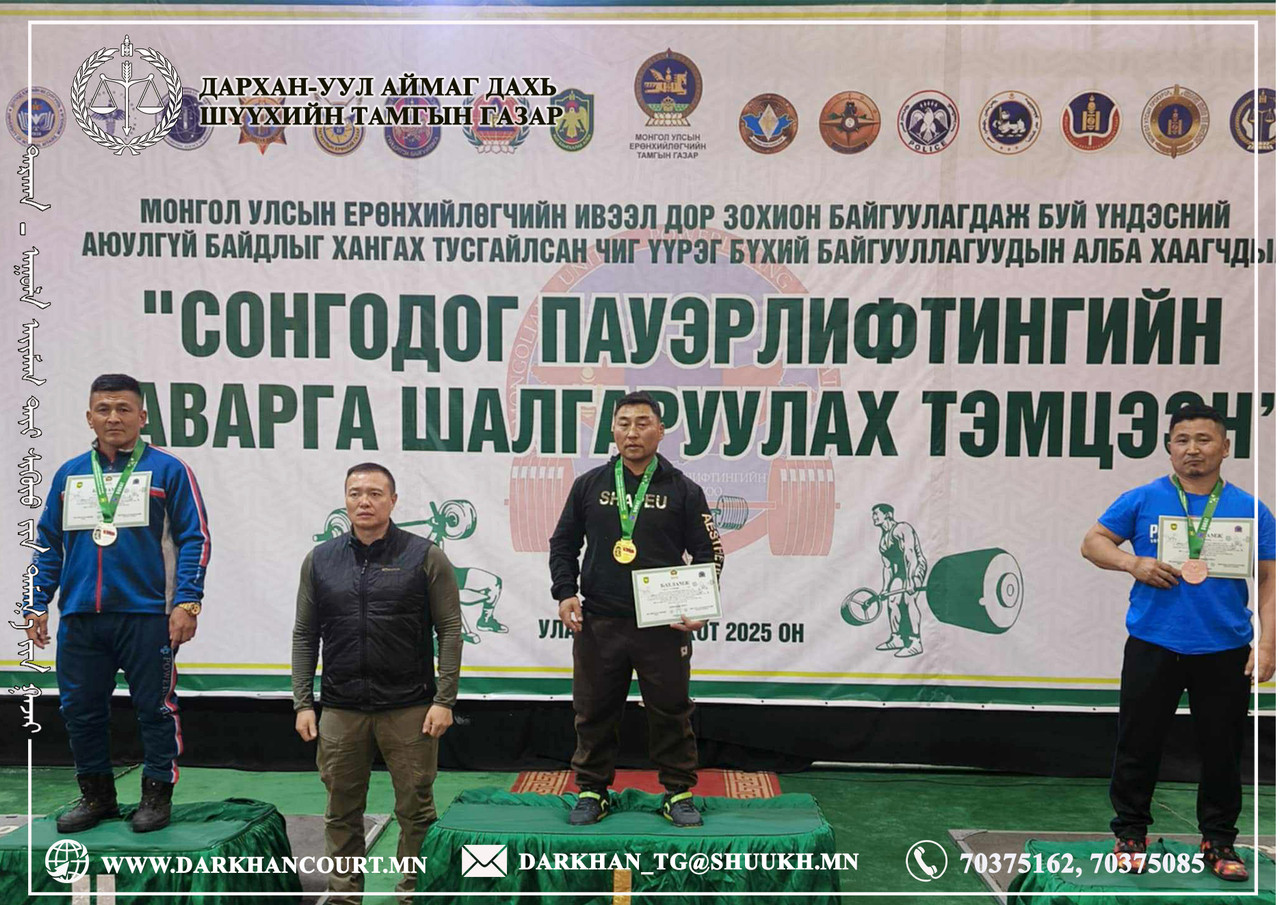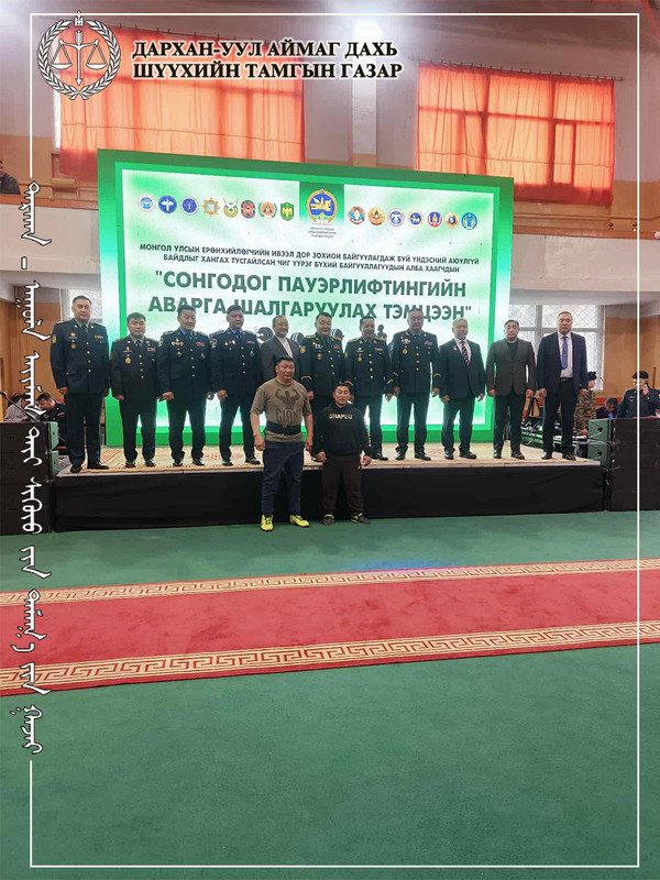 Монгол Улсын Ерөнхийлөгчийн ивээл дор зохион байгуулагдсан, Үндэсний аюулгүй байдлыг хангах тусгайлсан чиг үүрэг бүхий байгууллагуудын дунд “Сонгодог пауэрлифтингийн аварга шалгаруулах тэмцээн” болов. Тэмцээнд хууль сахиулах чиг үүрэг бүхий 15 байгууллагын 190 гаруй тамирчид оролцож штангтай суулт, таталт, хэвтээ шахалт гэсэн гурван төрөлд авхаалж самбаагаа сорилоо. 120 кг кг жинд таталт, суултын төрөлд Тамгын газрын тамирчин, аймгийн заан Д.Энхтүвшин тус тус хүрэл медаль, 74 кг жинд Пауэрлифтингийн спортын мастер Б.Мөнхдөл суултын төрөлд алтан медаль, таталтын төрөлд хүрэл медаль хүртэж, нийлбэр дүнгээр 3 дугаар байрт шалгарлаа.