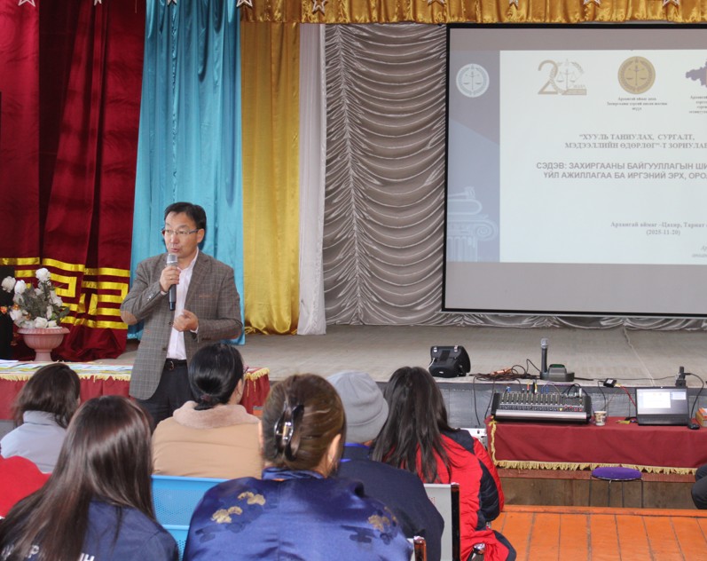 Монгол Улсад захиргааны хэргийн шүүх байгуулагдсаны 20 жилийн ойг тохиолдуулан Архангай аймаг дахь Захиргааны хэргийн анхан шатны шүүхээс санаачлан иргэдийн эрх зүйн мэдлэгийг нэмэгдүүлэх, шүүхийн ил тод, нээлттэй байдлыг хангахад чиглэсэн тодорхой ажлуудыг хэрэгжүүлж байна. Шүүхийн Тамгын газар, Гэмт хэргээс урьдчилан сэргийлэх ажлыг зохицуулах салбар зөвлөлтэй хамтран 19 суманд “Хууль таниулах, сургалт, мэдээллийн өдөрлөг” хийсэн. Ийнхүү үргэлжлүүлэн Цахир, Тариат суманд амжилттай зохион байгууллаа. Гарын авлага, тараах материалыг сургалтад оролцсон иргэд, албан хаагчдад өгөв. “Захиргааны байгууллагын шийдвэр, үйл ажиллагаа (Захиргааны ерөнхий хууль)”, “Иргэдийн түгээмэл холбогдож буй гэмт хэрэг, зөрчил тэдгээрээс урьдчилан сэргийлэх, анхаарах асуудал /Зарим төрлийн гэмт хэрэг, зөрчлийн жишээн дээр/” сэдвээр Архангай аймаг дахь Захиргааны хэргийн анхан шатны шүүхийн шүүгч А.Түвшинтулга, “Иргэний шүүхэд мэдүүлэх эрх, иргэний хэргийн шүүхээр түгээмэл шийдвэрлэгддэг хэрэг, маргаан, анхаарах зүйл” сэдвээр Архангай аймгийн Сум дундын Иргэний хэргийн анхан шатны шүүхийн Ерөнхий шүүгчийн туслах Э.Энххүү, “Шүүх дэх эвлэрүүлэн зуучлалаар шийдвэрлэх маргаан, иргэдийн анхаарах асуудал” сэдвээр Архангай аймгийн шүүх дэх эвлэрүүлэн зуучлагч Т.Нэргүйбаатар нар мэдээлэл хүргэж, сонирхсон асуултад хариуллаа.