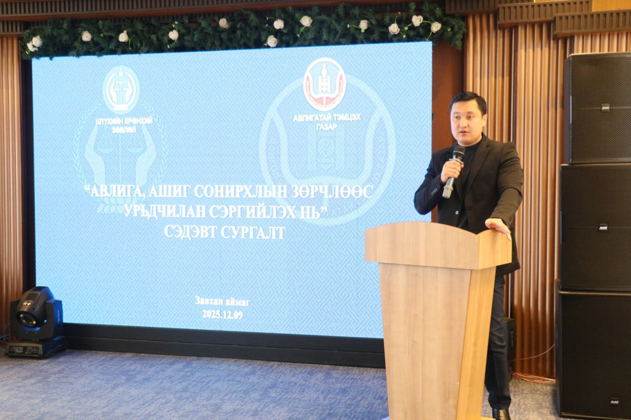 Мөн Улсын дээд шүүхийн ерөнхий шүүгч, Шүүхийн ерөнхий зөвлөлийн даргын хамтран баталсан “Авлигын эрсдэлийг бууруулах тусгайлсан төлөвлөгөө”-ний дагуу Авлигатай тэмцэх газартай хамтран бүсчилсэн сургалтыг зохион байгуулж байгаа бөгөөд өнөөдөр (2025.12.09) Завхан аймагт баруун бүсийн аймгуудын шүүхийн шүүгч, шүүхийн захиргааны холбогдох албан тушаалтнуудыг хамруулан зохион байгуулж байна.