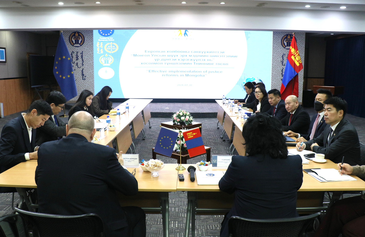 Шүүхийн ерөнхий зөвлөлийн дарга, гишүүд өнөөдөр (2026.01.20) Европын холбооны санхүүжилтээр хэрэгжүүлж буй “Монгол Улсын шүүх эрх мэдлийн шинэтгэлийг үр дүнтэй хэрэгжүүлэх нь” хосолмол түншлэлийн “Твиннинг” төслийн суурин зөвлөх Кристоф Кофецкитэй уулзалт хийлээ.