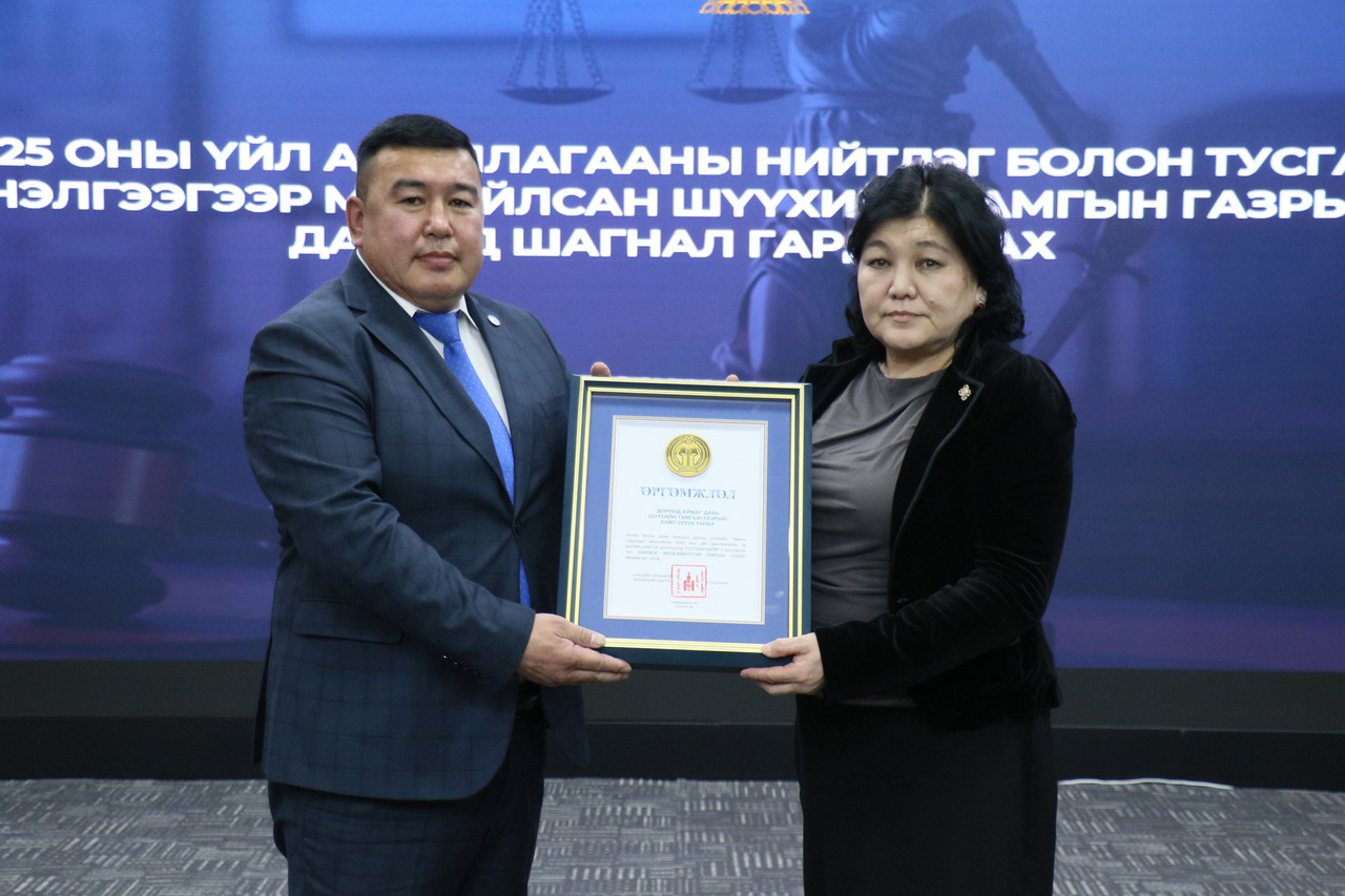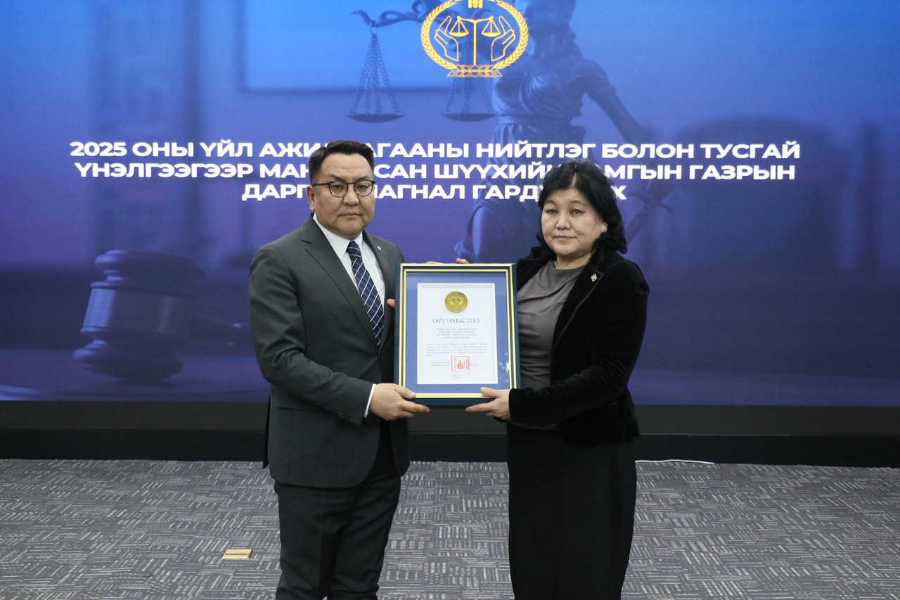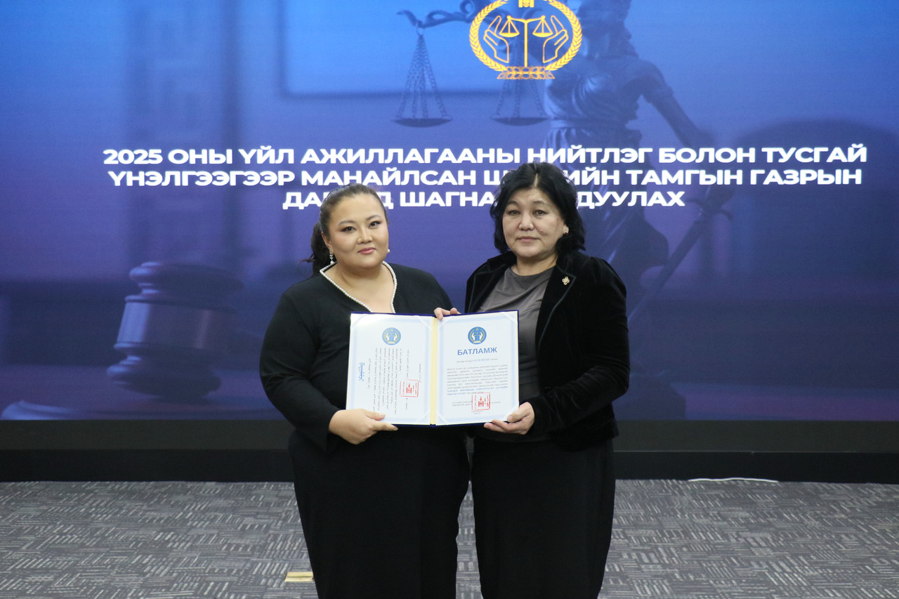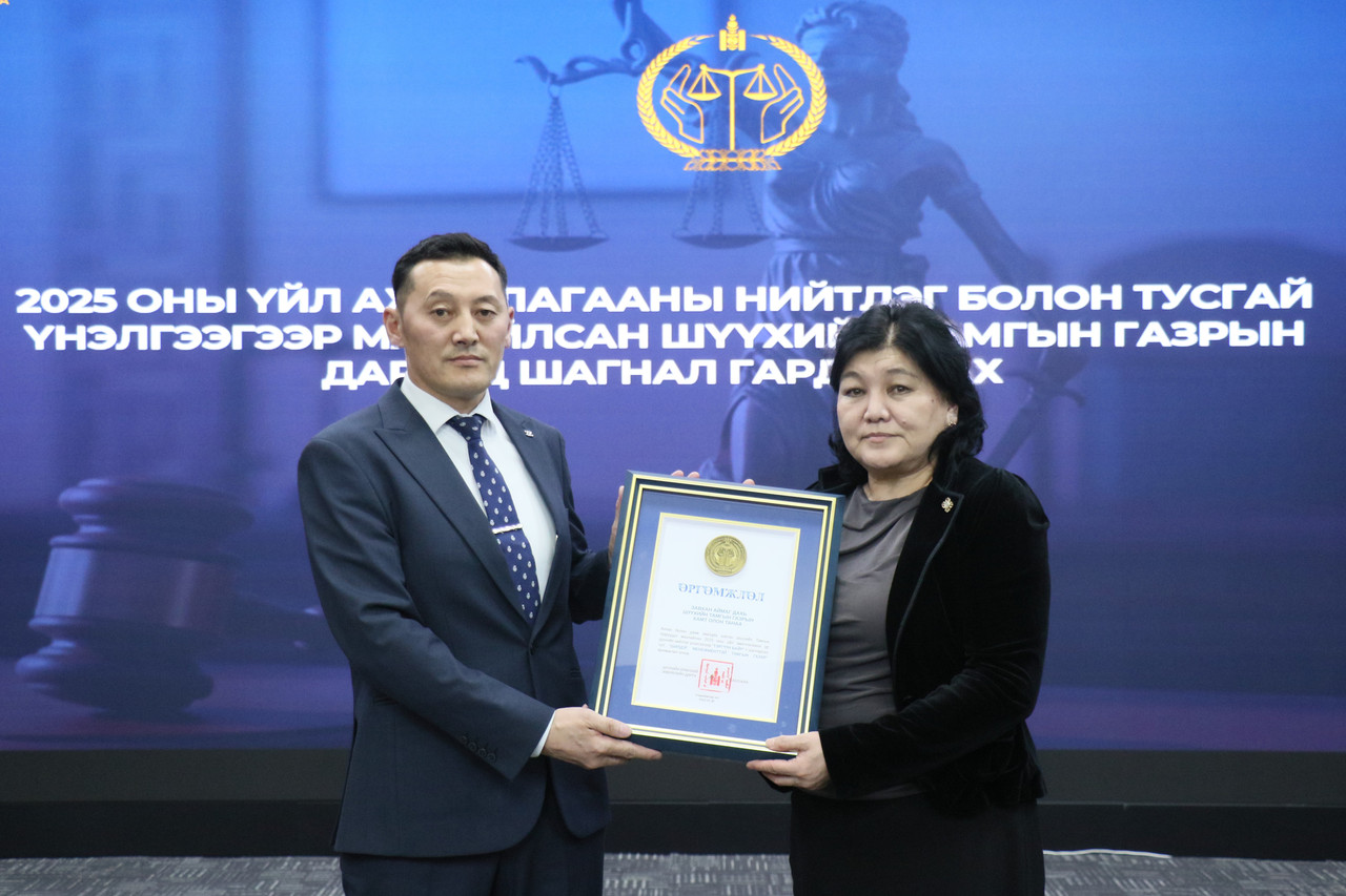 Шүүхийн ерөнхий зөвлөлийн дарга П.Золзаяа анхан болон давж заалдах шатны шүүхийн Тамгын газрын дарга нартай 2026 оны гүйцэтгэлийн төлөвлөгөө байгуулж, 2025 онд үйл ажиллагааны нийтлэг үнэлгээгээр эхний байруудад шалгарсан шүүхийн Тамгын газарт шагнал гардуулав.