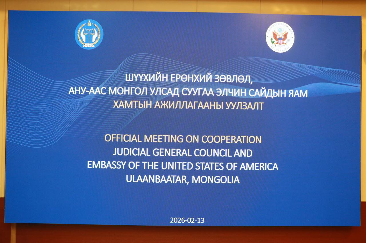 Шүүхийн ерөнхий зөвлөлийн дарга П.Золзаяа, гишүүн Г.Даваадорж, Гүйцэтгэх нарийн бичгийн дарга Б.Эрдэнэтулга нар өнөөдөр (2026.02.13) Америкийн Нэгдсэн Улсаас Монгол Улсад суугаа Элчин Сайдын Яамны Дэд тэргүүн Нийл Вермильэнийг хүлээн авч уулзлаа.