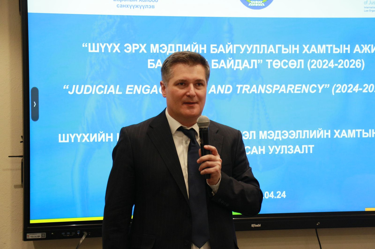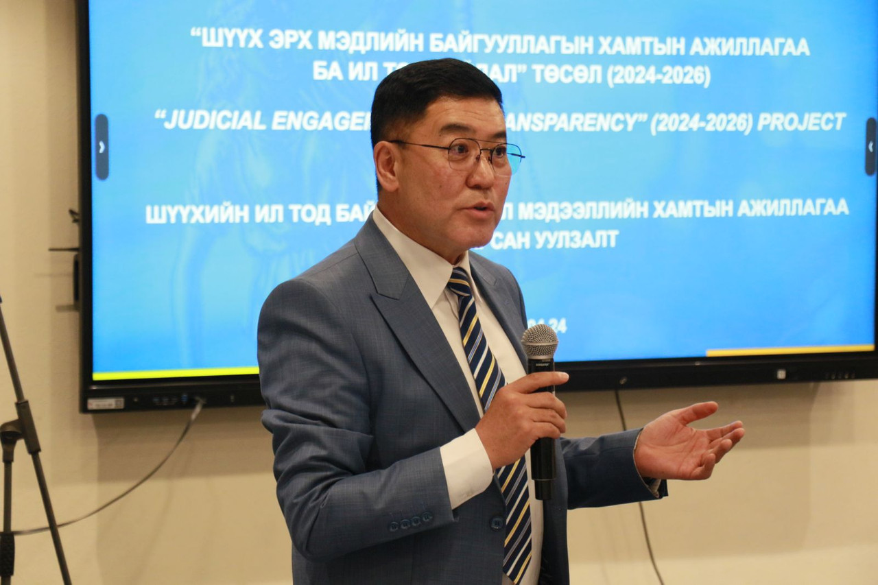 Шүүхийн ерөнхий зөвлөл, Европын холбооны санхүүжилтээр IDLO буюу “Олон Улсын эрх зүйн хөгжлийн байгууллага”-ын хэрэгжүүлж буй “ШҮҮХ ЭРХ МЭДЛИЙН БАЙГУУЛЛАГЫН ХАМТЫН АЖИЛЛАГАА БА ИЛ ТОД БАЙДАЛ 2024-2026” төслийн хүрээнд “Шүүхийн ил тод байдал ба хэвлэл мэдээллийн хамтын ажиллагаа” сэдэвт хамтарсан уулзалтыг (2026.04.24)-нд зохион байгуулав.