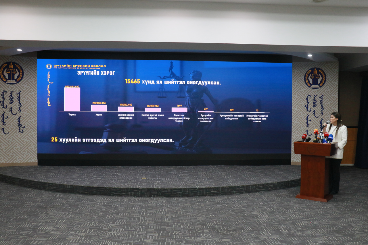 Шүүхийн ерөнхий зөвлөл өнөөдөр (2026.02.12) хэвлэлийн бага хурал зохион байгуулж, Монгол Улсын шүүхийн 2025 оны шүүн таслах ажиллагааны статистик, 2025 онд шүүгчдээс хөтлөн ирүүлсэн нөлөөллийн мэдүүлгийн шийдвэрлэлтийн дүн мэдээг олон нийтэд танилцуулав.
