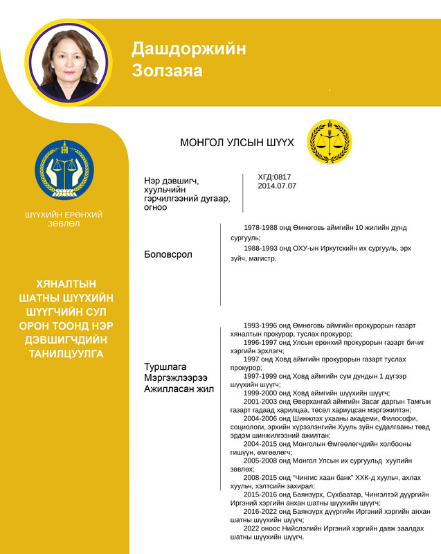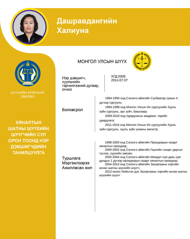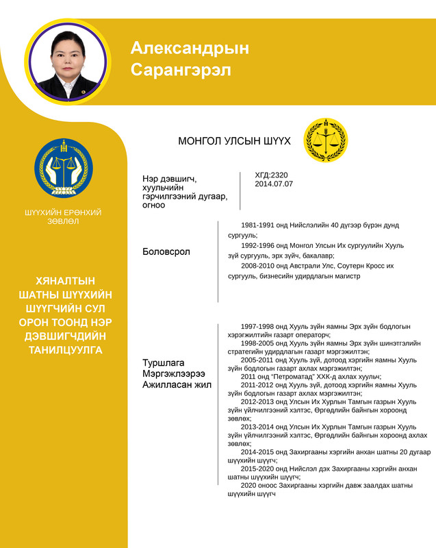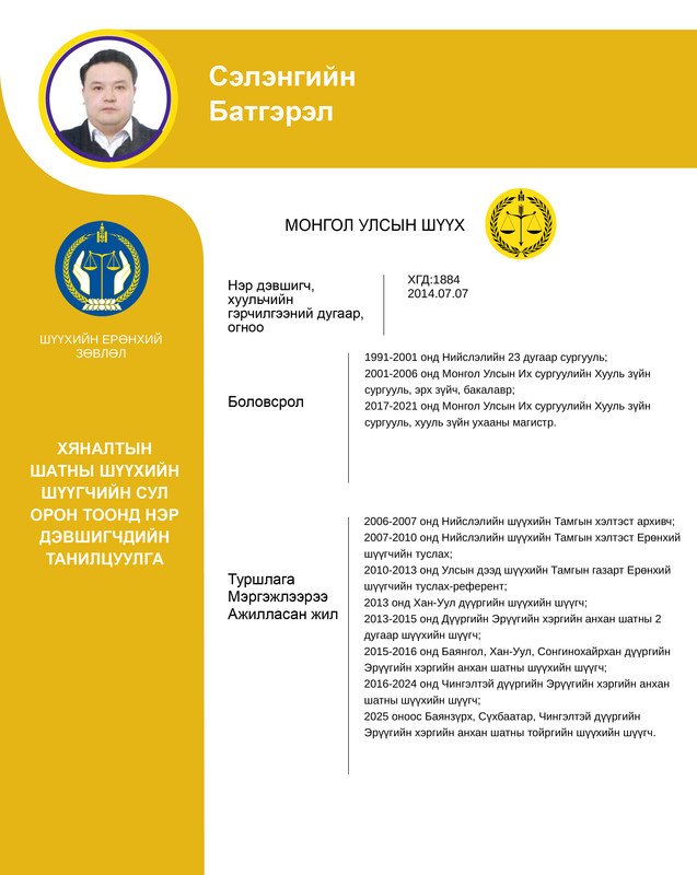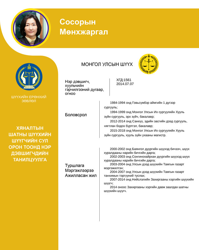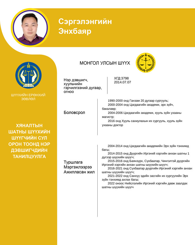 Хяналтын шатны шүүхийн шүүгчийн сул орон тоонд бүртгэсэн 12 нэр дэвшигчийн танилцуулгыг хүргэж байна. Нэр дэвшигчээс асуух асуулт, саналыг 14 хоногийн хугацаанд [email protected] цахим хаягаар хүлээн авна.