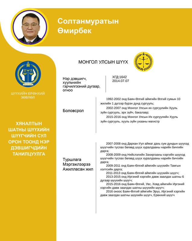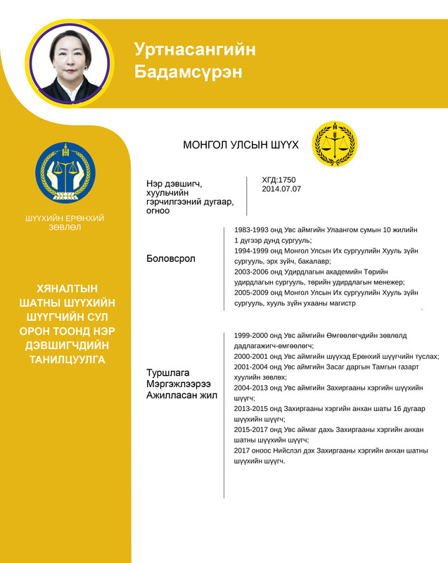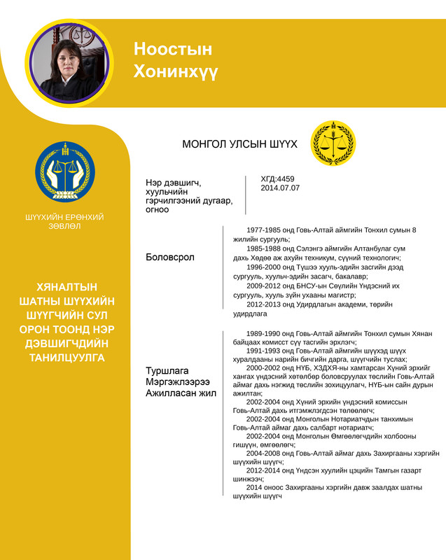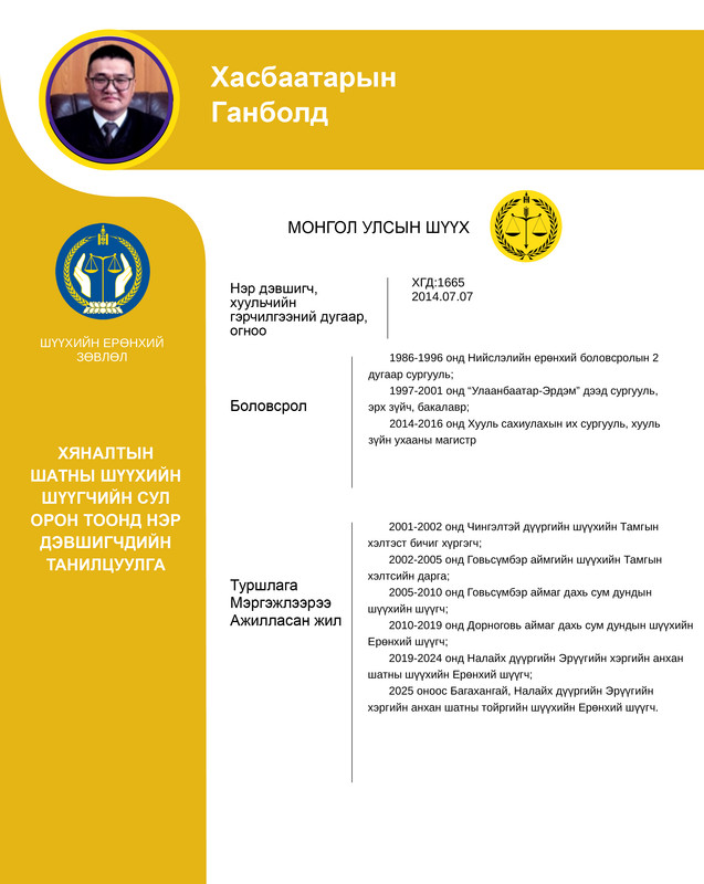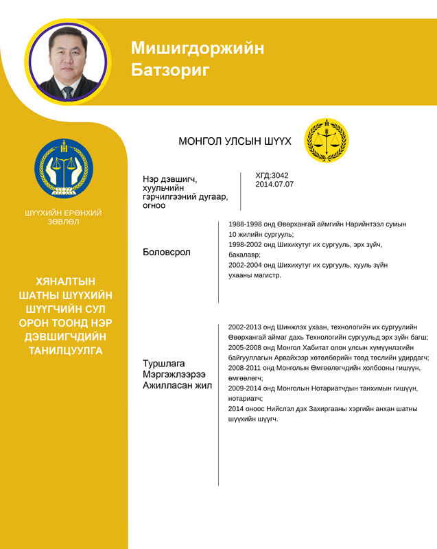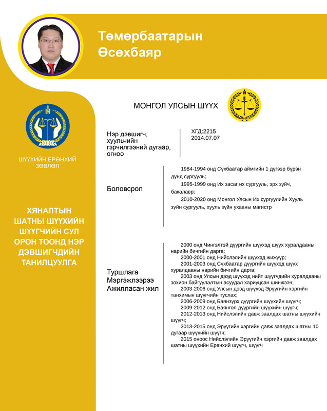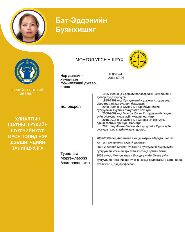 Хяналтын шатны шүүхийн шүүгчийн сул орон тоонд бүртгэсэн 12 нэр дэвшигчийн танилцуулгыг хүргэж байна. Нэр дэвшигчээс асуух асуулт, саналыг 14 хоногийн хугацаанд [email protected] цахим хаягаар хүлээн авна.