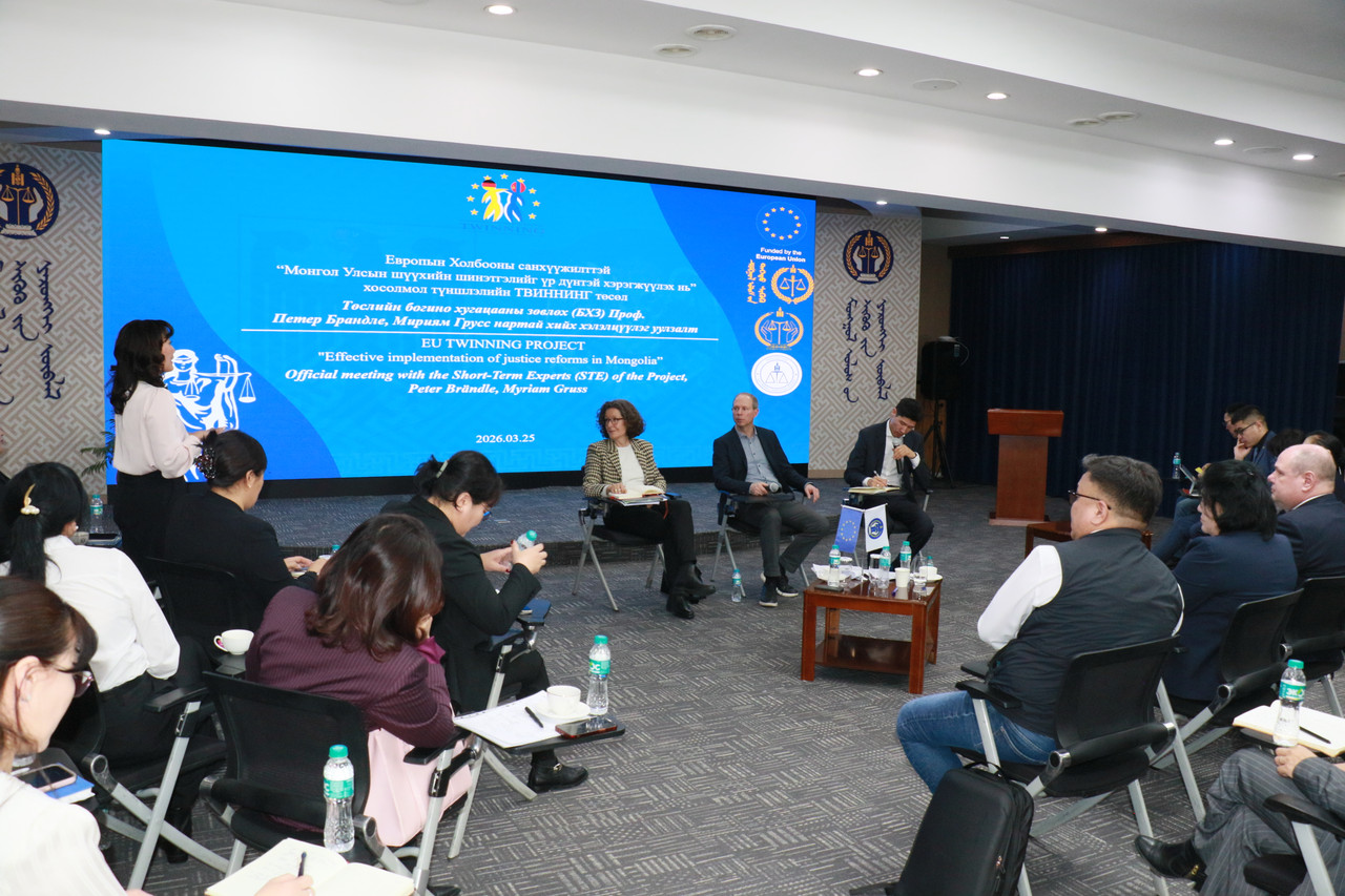 Энэ хүрээнд Шүүхийн ерөнхий зөвлөлийн дарга П.Золзаяа, гишүүн Х.Эрдэм-Ундрах, Эвлэрүүлэн зуучлагчдын зөвлөл, Монголын Хуульчдын болон Өмгөөлөгчдийн холбооны Эвлэрүүлэн зуучлалын хорооны төлөөлөл, Нийслэлийн шүүхийн эвлэрүүлэн зуучлагчид 2026 оны 03 дугаар сарын 25-ны өдөр төслийн суурин зөвлөх Кристоф Копецки, богино хугацааны зөвлөх, Нийгмийн хамгааллын хэргийн шүүхийн шүүгч Пeтер Брандлe, Бүсийн давж заалдах шатны шүүхийн Танхимын тэргүүн Мириям Грусс нартай уулзалт, хэлэлцүүлэг зохион байгуулав.