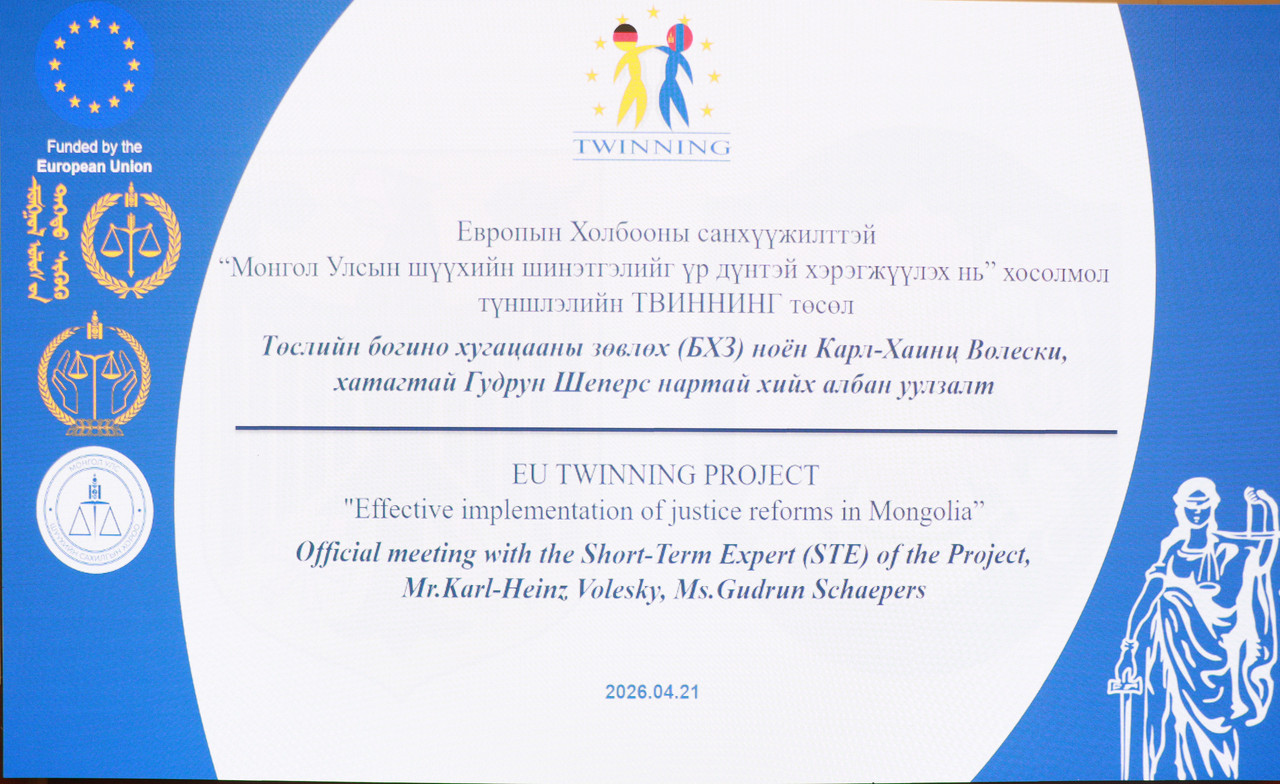 Шүүхийн ерөнхий зөвлөлийн дарга П.Золзаяа, гишүүн Ч.Баянжаргал, О.Жанчивнямбуу, Х.Эрдэм-Ундрах, Шүүгчийн сонгон шалгаруулалт, хүний нөөцийн газрын дарга Т.Сосорбарам нар өнөөдөр (2026.04.21) Европын холбооны санхүүжилттэй “Монгол Улсын шүүхийн шинэтгэлийг үр дүнтэй хэрэгжүүлэх нь” хосолмол түншлэлийн “Твиннинг” төслийн суурин зөвлөх Кристоф Копецки болон богино хугацааны зөвлөх Карл-Хаинц Волески, Гудрун Шеперс нартай уулзалт хийлээ.