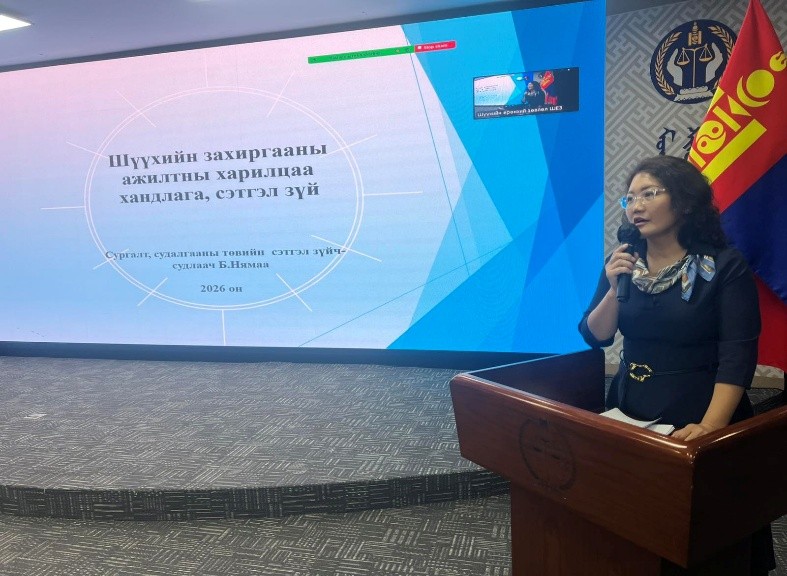 Шүүхийн ерөнхий зөвлөлөөс “Шүүхийн захиргааны ажилтны 2026 оны сургалтын төлөвлөгөө”-ний дагуу анхан болон давж заалдах шатны шүүхийн Тамгын газрын Мэдээлэл лавлагааны мэргэжилтнүүдэд зориулж ”Хэрэг, нэхэмжлэл, өргөдөл, гомдол, хүсэлт хүлээн авах, хуваарилах болон хэрэг маргааныг хянан шийдвэрлэх шүүгч, шүүх бүрэлдэхүүнийг сугалаагаар томилох нийтлэг журам, анхаарах асуудал” сэдэвт сургалтыг 2026 оны 04 дүгээр сарын 24-ний өдөр танхим болон цахимаар хамрагдав.